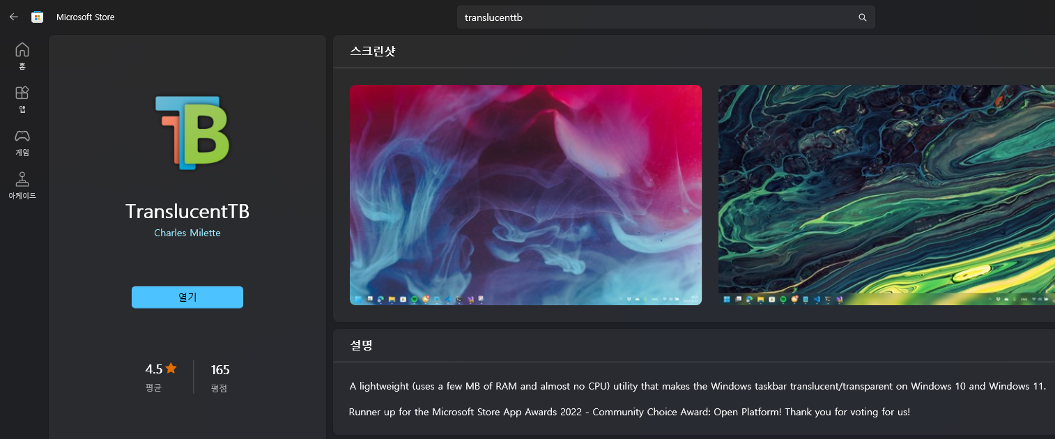 윈도우 시작 버튼 > Microsoft Store > translucenttb 검색