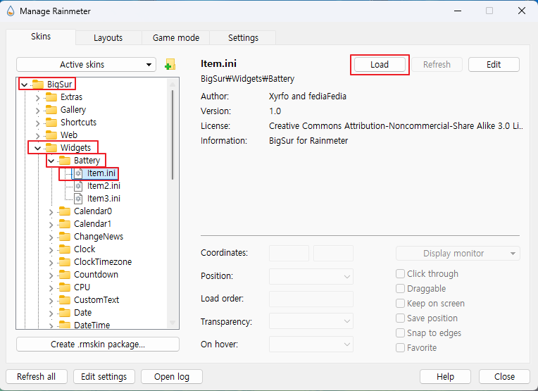 그러면 rainmeter 관리자에서 BigSur가 추가된 것을 확인할 수 있습니다.