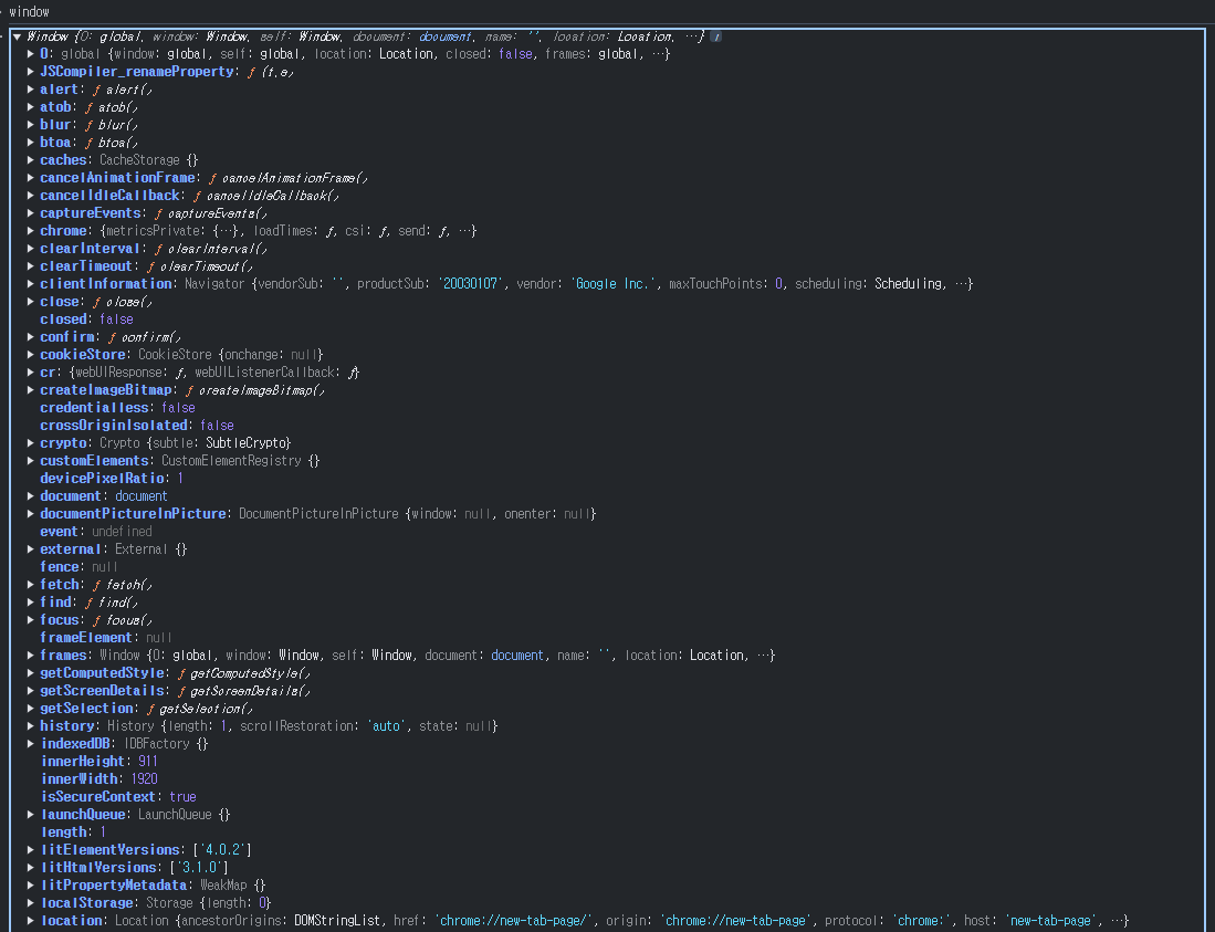 빈 사이트에서 위 코드를 사용하면 아래처럼 window 객체 중 width와 연관된 값만 가져올 수 있습니다.