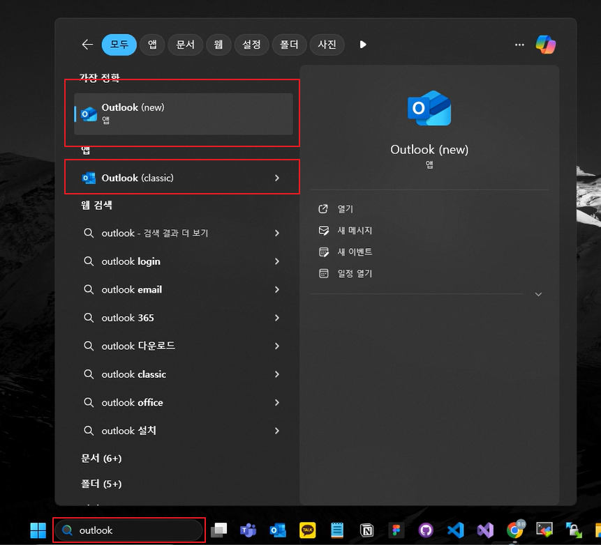 시작 버튼 클릭 > outlook 검색 > 새 Outlook 클릭