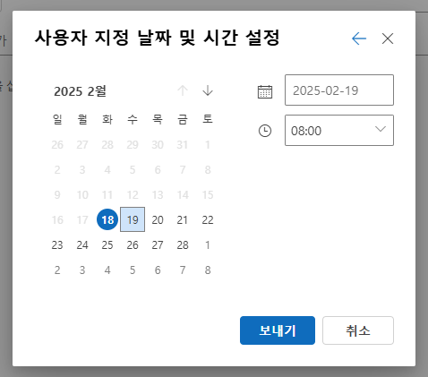 예약 발송을 쉽게 사용할 수 있도록 MS에서 애쓴 모습이 보입니다.