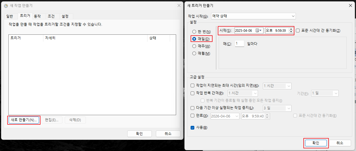 작업 스케줄러 관련 설정은 학습이 잘 되어있는지 어렵지 않게 원하는 설정을 줄 수 있었습니다.