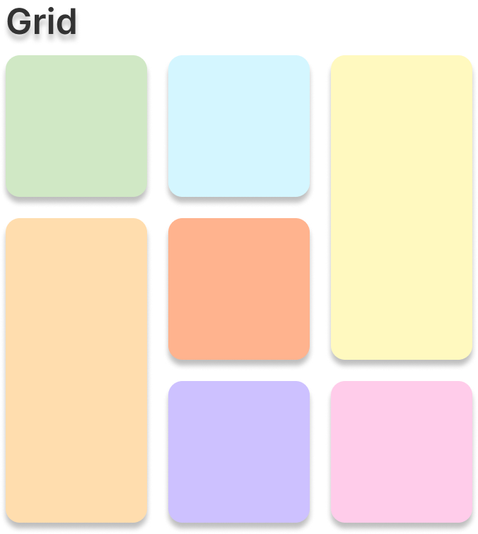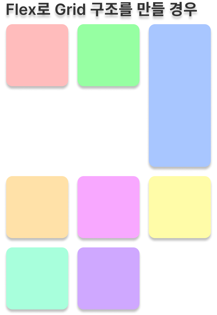 flex와 grid가 무엇이 다르냐 여쭤보시면 직관적인 설명으로는 아래 구조를 보여드릴 수 있을 것 같습니다.