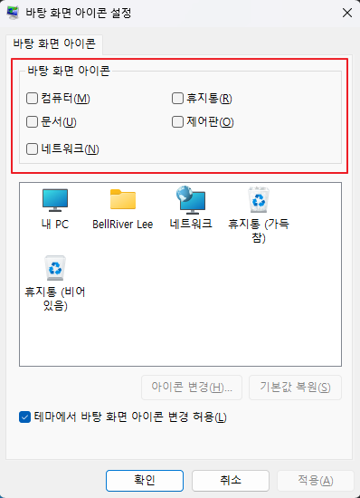 여기까지 온 김에 바탕화면에서 휴지통 같은 프로그램들을 보이지 않게 하고 싶으시면 아래 설정을 하시면 됩니다.
