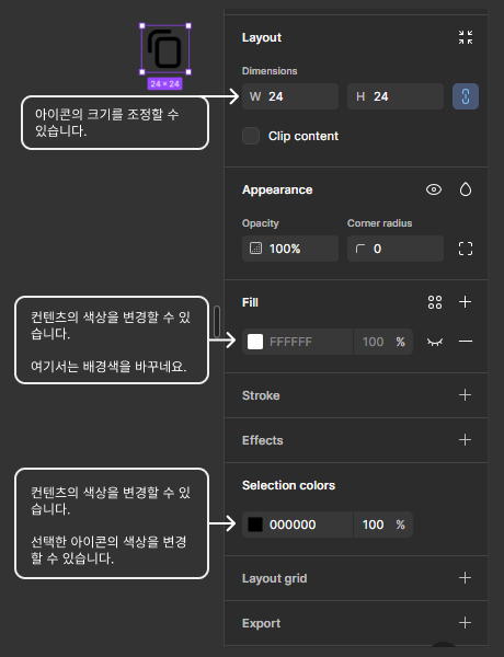 Ctrl + 좌클릭으로 바로 컨텐츠를 선택할 수 있습니다. - 복사한 아이콘의 색상과 크기를 수정할 수 있습니다.