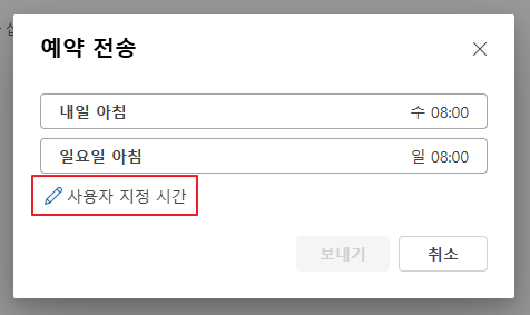 예약 발송을 쉽게 사용할 수 있도록 MS에서 애쓴 모습이 보입니다.